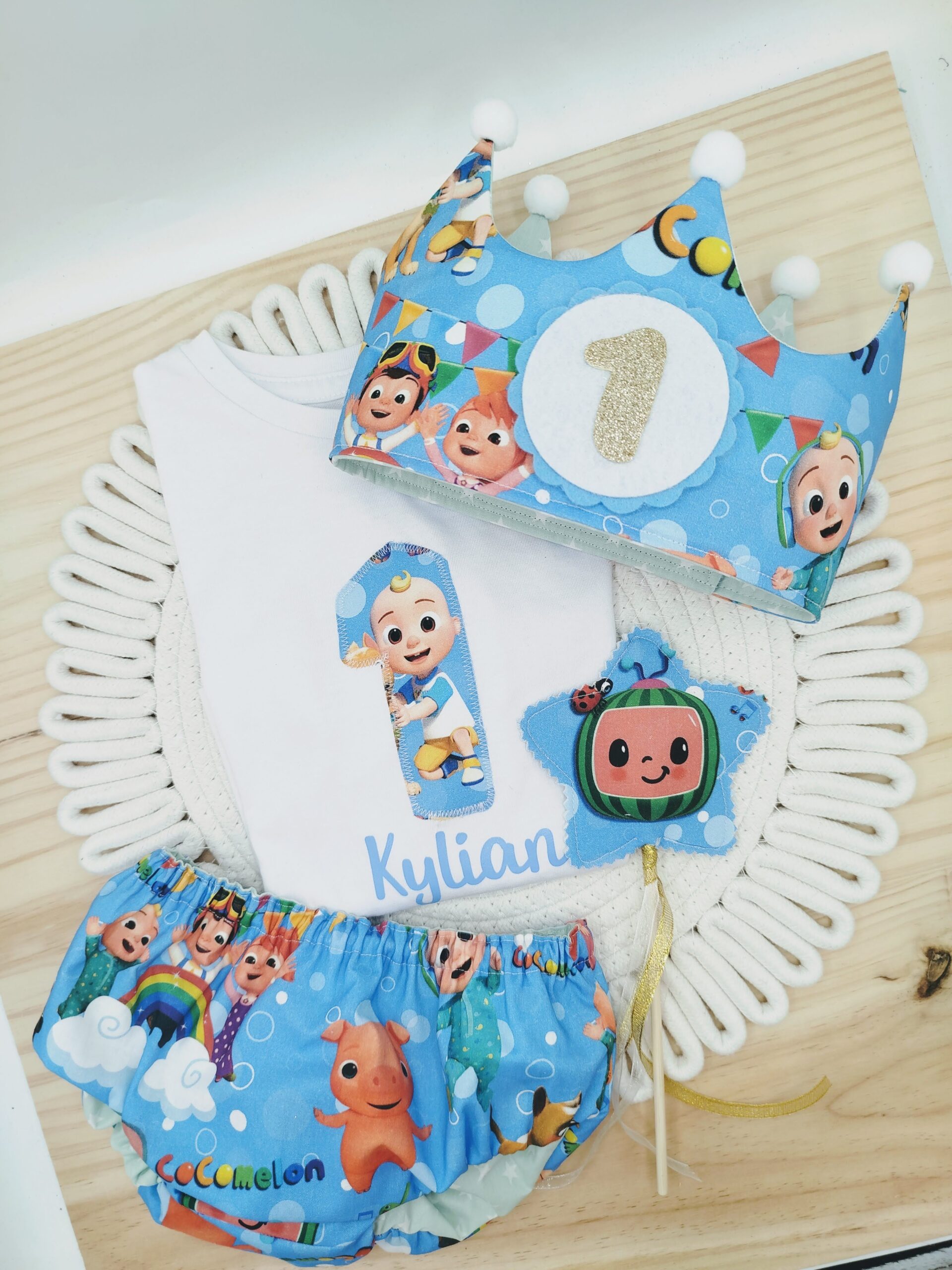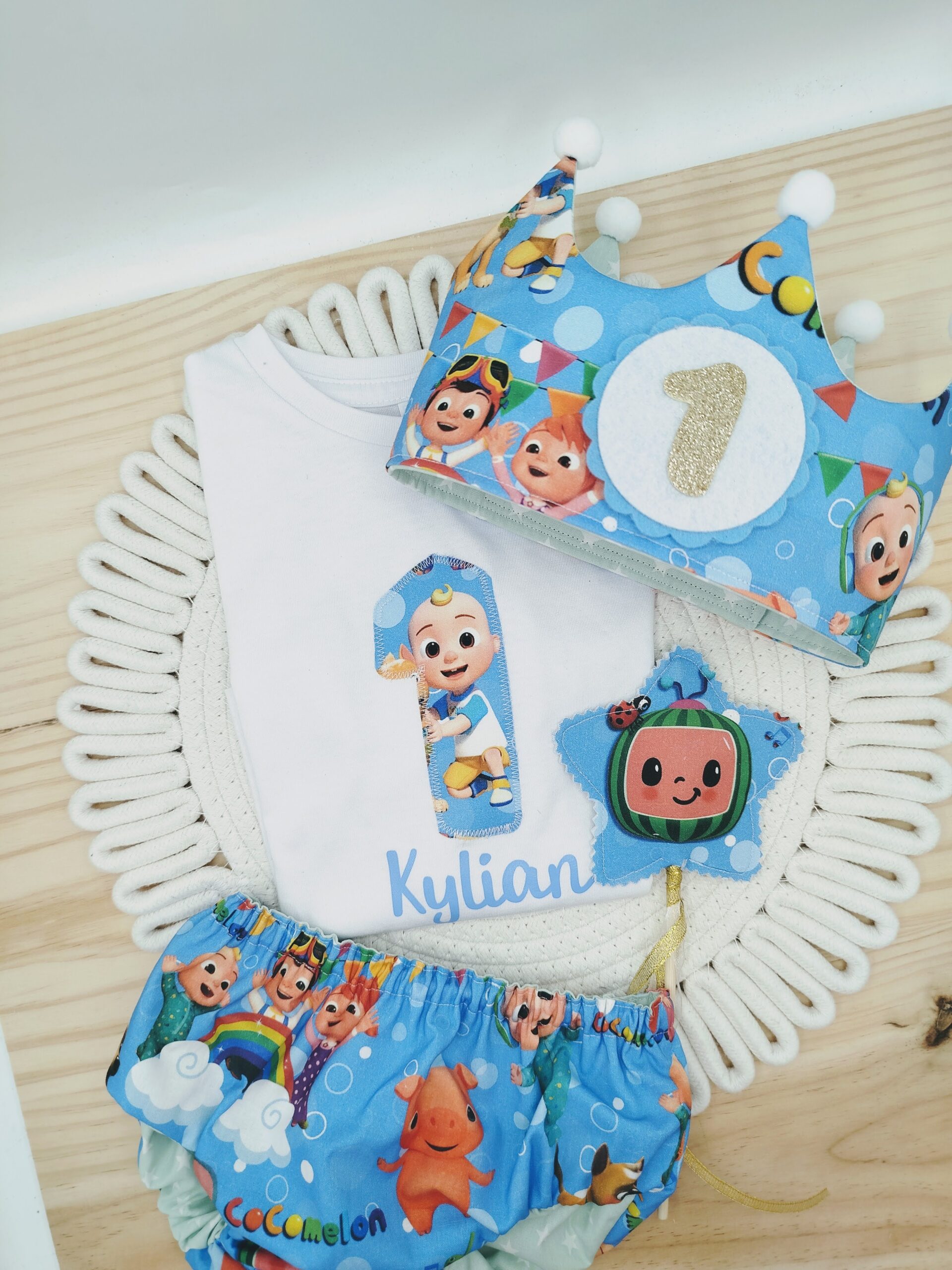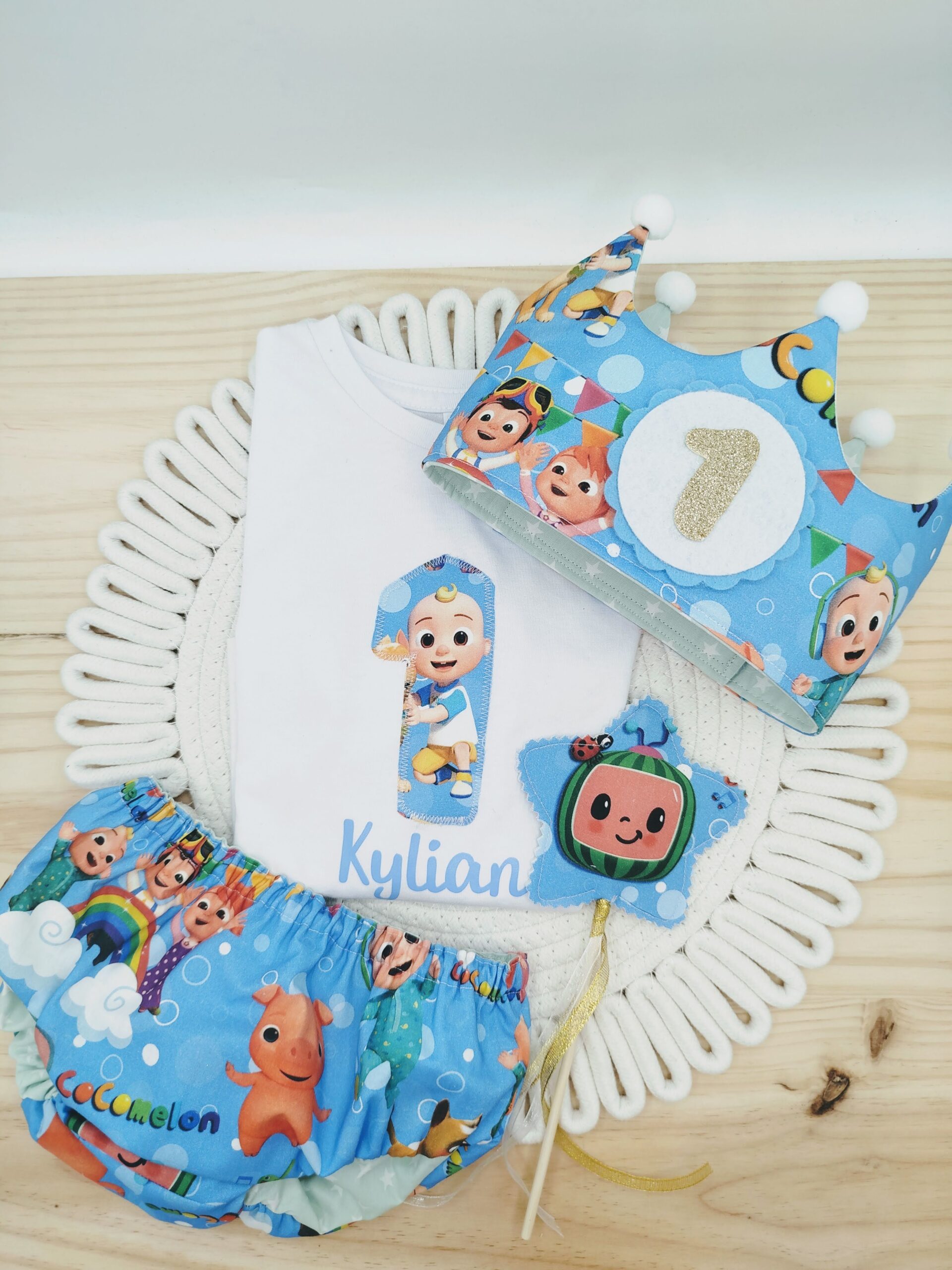 Este conjunto de primer cumpleaños para bebé incluye una camiseta personalizada con el número 1 y el nombre, una ranita a juego con diseño Cocomelon y una corona de cumpleaños artesanal, suave y cómoda, pensada especialmente para su delicada cabecita. Cada pieza está confeccionada a mano, cuidando cada detalle para ofrecer comodidad y libertad de movimiento durante toda la celebración.