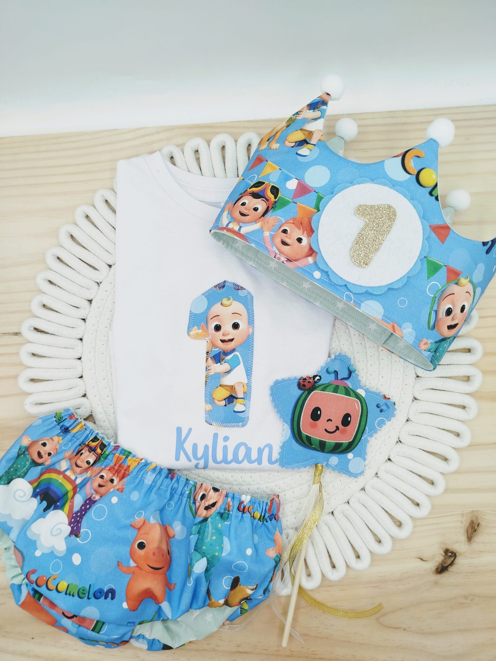 Celebra el primer cumpleaños de tu bebé con nuestro conjunto de cumpleaños Cocomelon personalizado, diseñado para que sea el gran protagonista de un día lleno de ilusión, color y recuerdos inolvidables.